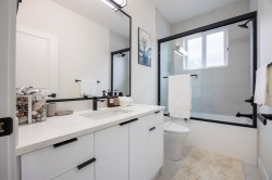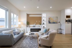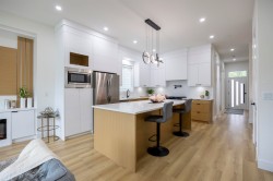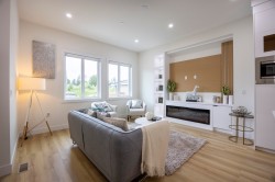Discover this exceptional new development in Willoughby featuring half-duplex homes with no strata fees. These modern 4-bedroom, 5-bath residences are designed for ultimate comfort and style, offering 10-foot ceilings on the main floor, expansive windows that fill the home with natural light, a chef-inspired kitchen with quartz countertops and premium appliances, and a spacious primary suite with a walk-in closet and serene park views. The fully finished basement includes a bedroom, media room, and large living area—perfect for extended family or guests. Ideally located near Donna Gabriel Robins Elementary, Peter Ewart Middle School, and R.E. Mountain Secondary, this community delivers a perfect blend of elegance, functionality, and convenience. The front yard is virtual staged.