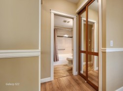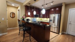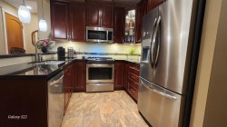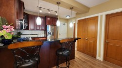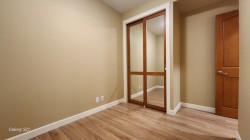 Welcome to luxury.This spacious home featuring 2 bedrooms & den w/closet,2 full baths w/heated floors & fog free mirrors & 9 foot ceilings. Enjoy your year round private Solarium,with gas bbq,ceiling fan and retractable glass panels.All acoustic wood-grained plank floors thru-out & gourmet solid wood cabinet kitchen, granite counters,high end SS appliances, gas stove. A/C heat pump. Wall, ceilings & floors are acoustic quality. 2 underground parking stalls(7' high access)w/secured concrete walled mini garage(9'8"x8') having a plug for your EV car.Good visitor parking. Easy Hwy1 access. Transit close, walk to nearby Willoughby Town shopping center and parks.