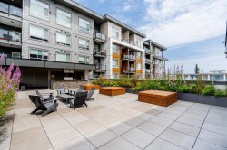 Prime Alexander Square location, steps from Willoughby Town Centre, restaurants, schools, transit, and highways. This like-new 1 bed plus den, 1 bath RDG home offers bright south-facing exposure overlooking the courtyard. The kitchen features quartz counters, Whirlpool stainless steel appliances, washer/dryer, microwave, and a Mysa smart thermostat. The bedroom and walk-in closet are carpeted for comfort. Parking access via 80th St. and through the adjacent townhouse with fob entry to the two-level parkade. Amenities include a gym, lounge, rooftop deck with BBQs, courtyard with fire pits, and community garden plots. Well-run strata includes hot water and caretaker, offering move-in-ready comfort and convenience.