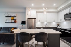 Prime Alexander Square location, steps from Willoughby Town Centre, restaurants, schools, transit, and highways. This like-new 1 bed plus den, 1 bath RDG home offers bright south-facing exposure overlooking the courtyard. The kitchen features quartz counters, Whirlpool stainless steel appliances, washer/dryer, microwave, and a Mysa smart thermostat. The bedroom and walk-in closet are carpeted for comfort. Parking access via 80th St. and through the adjacent townhouse with fob entry to the two-level parkade. Amenities include a gym, lounge, rooftop deck with BBQs, courtyard with fire pits, and community garden plots. Well-run strata includes hot water and caretaker, offering move-in-ready comfort and convenience.