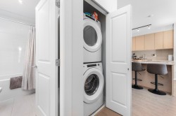 Experience resort-style living at Union Park by Polygon Homes in the heart of Langley. This bright 2 bedroom, 2 bathroom home features overheight 9 ft ceilings, engineered stone countertops, and sleek stainless steel appliances; including a 17 cu ft fridge, gas range, dishwasher, and microwave with hood fan. Enjoy exclusive access to over 12,000 sq ft of amenities at the Union Club with an outdoor pool and whirlpool spa, air-conditioned fitness studio, gymnasium, fireside and bar lounges, games room, dog wash, two guest suites, music rooms, and more. Step outside to 85,000 sq ft of extra outdoor amenity space with a private park, children’s play area, community garden, and BBQ terrace. Includes EV-ready parking in front of the elevator and storage. Showings BY APPOINTMENT.