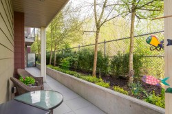 Rare 3 Bedroom ground floor unit in sought-after Elements! This spacious layout features an open-concept kitchen and living area filled with natural light, backing a private 40 ft patio and peaceful greenspace. Freshly painted with a light color scheme, quartz counters in kitchen and baths, and brand-new carpets throughout. Ideal layout with two bedrooms down the hall, separate from the Primary suite with double sinks and a large walk-in closet. Perfect for downsizers or single-level living. Includes in-suite storage, locker, and 2 parking. Walk to shops, dining, and more—quiet, tucked-away location!