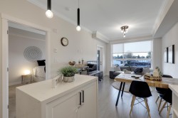 INSPIRE! Thoughtfully designed 656 sq ft, JR 2 bedrooms + 1 bath home checks all boxes! Better than brand new , NO GST! This functional layout is enhanced by elegant white quartz countertops, stainless steel undermount sinks, an imported Italian tile backsplash, and quality stainless steel appliances. Huge deck off the living room is facing outdoor amenity area w/ open view. Perfect start for a small family! Enjoy access to premium amenities, including a fully equipped gym with cardio and weightlifting gear, a yoga studio, a social lounge with ping pong and foosball, and rooftop patios. Central location close to shopping, transit, schools, medical clinic and parks.