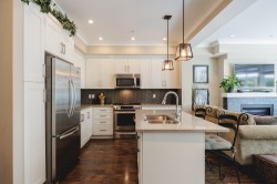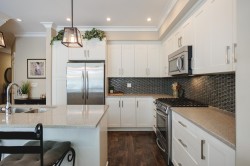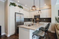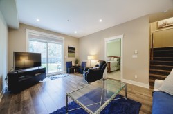 GREENBELT DREAMHOME! Step into the ultimate in privacy at "Two Birds" by award winning Walmark Homes. This over 2200 s.f. unit is loaded with thoughtful upgrades and quality finishes. Side by Side double garage, entertainers dream stone island kitchen with gleaming white cabinets and stainless appliances including gas stove. Open concept main floor with floor to ceiling and wall to wall windows taking full advantage of the permanent greenbelt. Large deck with gas hookup. Three large bedrooms upstairs including over-sized primary also enjoying greenbelt outlook, walk in closet, and opulent 5 piece en-suite. Basement offers a 4th bedroom, full bathroom and large recreation room with sliding glass doors out to large covered patio and fully fenced yard overlooking greenbelt.
