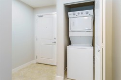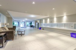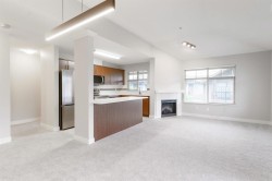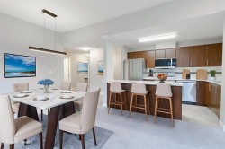 Welcome to Urbano—this top-floor corner unit offers over 930 sq ft of beautifully updated living space. Step into a bright, open layout with vaulted ceilings and large windows that fill the home with natural light. The renovated kitchen shines with new quartz counters, an undermount sink, stylish faucet, new lighting, and four stainless steel appliances—perfect for cooking and entertaining. The spacious living and dining areas flow seamlessly, with new flooring and fresh paint throughout. Two generous bedrooms are thoughtfully separated for privacy, alongside two full bathrooms and a versatile den ideal for a home office. Includes two side by side parking stalls in a well-managed, pet-friendly building. All just steps to shopping, dining, transit, and more.