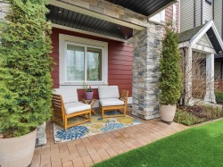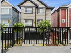 Welcome to this detached bare land strata home with a fully fenced, low-maintenance front yard with artificial turf. Luxury vinyl plank flooring spans the main floor, featuring a spacious living room with built-in electric fireplace and French doors to a covered sun deck. The dining area sits across from the modern kitchen with quartz countertops, stainless steel appliances, and gas range. A second balcony is off the kitchen near the two-piece guest bath and stacking laundry. Upstairs offers a bright primary bedroom with ensuite and glass-enclosed shower, plus two additional bedrooms and a full bath with deep soaker tub. Side-by-side double garage with storage. Own your 32 x 49.8 lot with ultra-low strata fees of $75.38/month. Pet-friendly: 2 cats or dogs, or 1 of each. Central heating/AC.