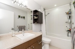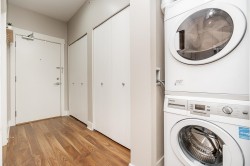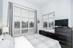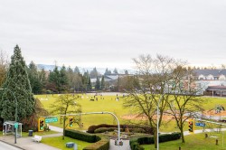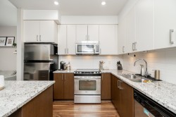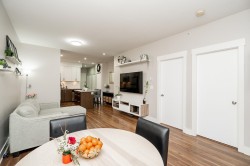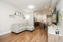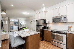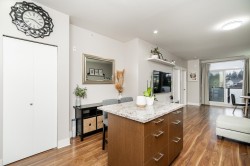 RARELY AVAILABLE! Top floor, 749 sq ft, 1 Bed & DEN suite with open layout, high quality laminate flooring throughout, granite counters, SS appliances, kitchen island w ample storage, large windows & soaring 12 ft ceilings in the primary bedroom. Generous Den is perfect for a home office, gym, guest bedroom, storage or nursery. Uncovered South facing deck overlooking Terry Hughes park with great sunlight throughout the day. Well maintained "EightWest" building is located in highly desirable Glenbrooke North neighbourhood close to schools, parks, shopping, restaurant, transit, Justice Institute & the new Aquatics center! 1 parking & 1 locker included. 2 Pets allowed & Rentals OK. EASY TO SHOW BY APPOINTMENT!