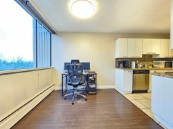 Welcome to this bright and spacious Uptown home! This 2-bedroom, 1.5-bath northwest corner unit offers a southwest exposure , filling the space with natural light. Enjoy an open balcony with beautiful city views, warm laminate flooring throughout, and a refreshed galley-style kitchen. Both bedrooms are generously sized, with the primary featuring a convenient 2-piece ensuite. Enjoy the strata's well-maintaned landscaped gardens and clubhouse, or step across the street to Moody Park. A convenient location just steps to bus stops, Lord Kelvin Elementary, New Westminster Secondary, Walmart, Save-On-Foods, restaurants, recreation, and Royal City Centre Shopping. Everything is within walking distance! Includes 1 parking stall and 1 storage locker.