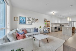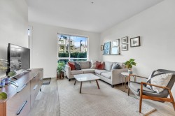 Spacious 1-bedroom condo built in 2019 with quality construction throughout. This home offers a rare house-like feel with its own private front door and expansive 14’ x 21’ patio (294+ sq ft)—perfect for outdoor living and entertaining. The open-concept layout is nearly 12 ft wide with 9-ft ceilings, creating a bright, airy, and comfortable space. Features include radiant in-floor heating, 5-burner gas stove, stainless steel appliances, double kitchen sinks, and large windows for excellent natural light. Enjoy the best of both worlds with quick access to Lonsdale Quay, rapid transit, and shops, while surrounded by nature, including the Spirit Trail, Moodyville Park, and nearby basketball courts. Pets and rentals allowed. 1 Parking, 1 Storage.