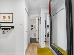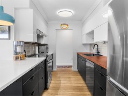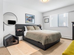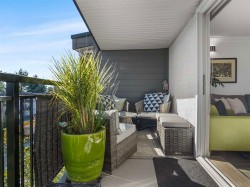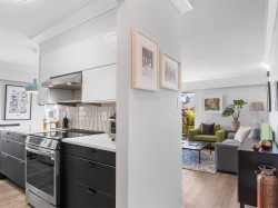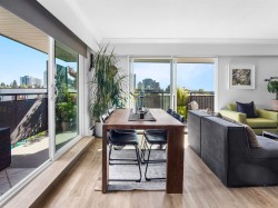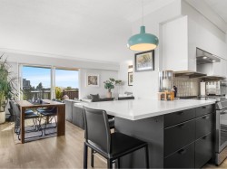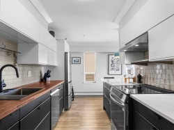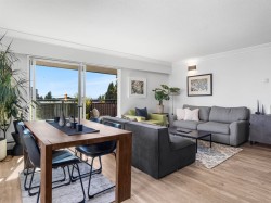 Top floor, south facing corner unit in Central Lonsdale! This gorgeously renovated 2BR/1BA condo has extensive updates. In the kitchen, recent appliances with induction stove plus all new cabinets, wood and stone countertops extended to an eating area. The large, bright living/dining area features durable wide plank vinyl floors, plus an updated gas fireplace and looks out to a huge and sunny wrap around balcony that overlooks the treed street. Beautifully tiled bathroom has an updated shower with inset nooks for storage. Recent closet doors, light fixtures. The well-run building has many upgrades including balconies, windows, sliding doors, electrical, plumbing. Steps away from all Central Lonsdale shops, medical, new Harry Jerome and minutes to the highway. 1 pkg, 1 stg, dog or cat ok.