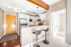 Experience elevated living at Seasons, a rare sub-penthouse corner suite with 2 bedrooms and 2 bathrooms, soaring 9-foot ceilings, and spectacular south-facing water and fountain views. The gourmet kitchen features stainless steel appliances, granite counters, and a sleek eating bar, while the inviting gas fireplace adds warmth. Enjoy in-suite laundry, 2 side-by-side parking stalls, and a storage locker. Exclusive amenities include a gym, party room, theatre room, and on-site resident manager. Just moments from Parkgate Shopping Centre, this home blends sophistication, comfort, and convenience.