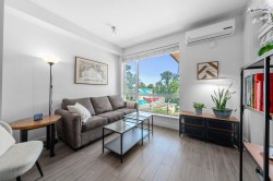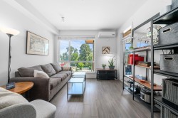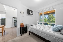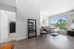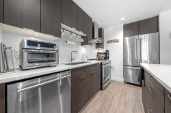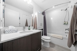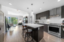 The Shore - Beautiful 2-bedroom 2-bath home in an award-winning building in a great central location. South-facing orientation with city skyline views. Open concept floor plan with floor-to-ceiling windows, stainless steel and quartz kitchen with island, wide plank flooring, in-floor radiant heat, air conditioning, separated bedrooms both with en-suite bathrooms and ample closets, pantry storage, in-suite laundry, and a large covered deck for outdoor entertaining. Complex features include a gym, a yoga studio, secured parking, and a storage locker. Offering a great lifestyle, steps to the North Shore Spirit Trail, and easy access to Lonsdale Quay and the Sea Bus.