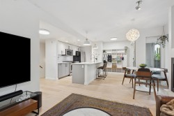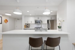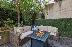 Rarely available concrete two-level townhome in the heart of Central Lonsdale.This home showcases a thoughtful reverse floor plan with two private bedrooms on the lower level,including a generous primary suite with spacious walk-through closets. Upstairs, the main level offers a bright, open layout with floor-to-ceiling windows, a chef-inspired kitchen, and a convenient powder room. Recent upgrades include engineered hardwood and carpet,new cabinetry with custom pull-out pantry, Caesarstone quartz counters,barn doors in the bedrooms,and custom organizers in the primary closets. The large,private patio has been newly retiled and features a natural gas hookup-ideal for outdoor dining and entertaining.Ample in-suite storage plus an additional storage locker complete this exceptional offering.