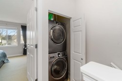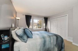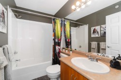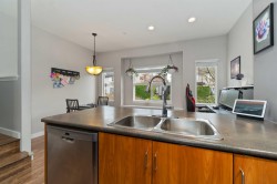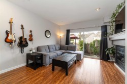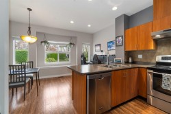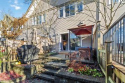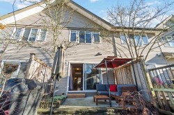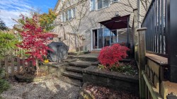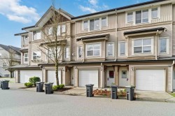Mountain View Estates. This beautifully kept 2-bedroom, 3-bathroom townhouse is situated in a fantastic location in the complex with a lush green space at the back for exceptional privacy. The landscaped garden patio is a true delight & is perfect for relaxing & entertaining. The main floor showcases laminate flooring throughout, a spacious kitchen offering a breakfast bar, tiled backsplash, pot lights & a generous eating area with a charming bay window. The living room boasts a cozy fireplace, 2 piece bathroom on the main & direct slider access to the yard. Upstairs are two very spacious bedrooms, including a primary w/large closets & a 3-piece ensuite bathroom with a walk-in shower. EV charger in the garage. Book your private viewing today. ** OPEN HOUSE SATURDAY FEB 14TH 2 TO 4 PM**