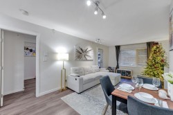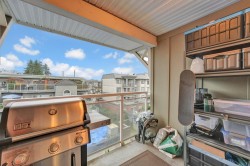 Move-in ready and beautifully updated 2 bedrooms and 2 baths top-floor condo in the heart of Port Coquitlam. Updated kitchen features modern cabinets, breakfast bar, granite counters and SS appliances. The dining and living areas open onto 2 covered balconies - perfect for year-round enjoyment. Bedrooms are thoughtfully situated on opposite sides of the living room for privacy, with the primary offering a walk-in closet and a nook for a home office. Enjoy updated laminate flooring throughout and a large laundry room with ample storage. The well-managed strata allows 2 pets and the building has a new roof. Ideally located on a quiet street, just steps from schools, Gates Park with its multiple sport fields & scenic Traboulay Trail, recreation center, shops, restaurants & West Coast Express.