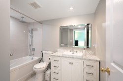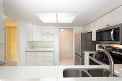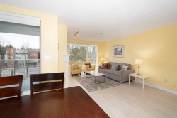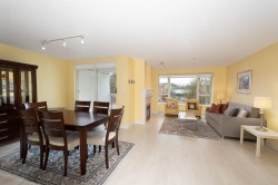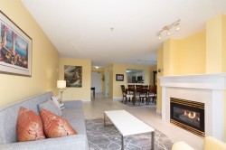 Spacious 1,107 sq ft, 2 bedroom, 2 bathroom condo located in the heart of Newport Village. Features an extra-large dining room, bright and spacious living room with a cozy gas fireplace, and laminate flooring throughout. Well-designed layout with excellent separation of living and sleeping areas. The primary bedroom is generously sized with a walk-in closet, private balcony, and updated 4-piece ensuite with soaker tub. Second bedroom is ideal for guests or home office. Main bathroom updated with walk-in shower. Enjoy two balconies, including one covered. Gas and hot water included in the strata fee. Includes one parking stall and a large storage locker. Amenities include an exercise room and hot tub. Steps to shops, restaurants, SkyTrain, Library, Rec Centre, and Rocky Point Park.