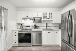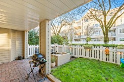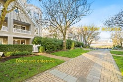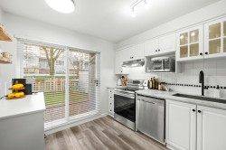 Rare unit, tastefully updated 3 bedroom, 2 bathroom, 1,030 sq ft corner garden level home with a spacious entertainer’s patio and private fenced yard. Enjoy direct private access into the unit and walk-out access to the water. Recent updates include new flooring, paint, doors, stainless steel appliances, and modern lighting throughout. Ideally located within walking distance to the dyke trail, Olympic Oval, T&T, restaurants, and more. Book your private showing today