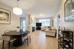 Welcome to Meridian Gate by Polygon! Spacious and bright 1,080 sq ft 2 bedroom, 2 bathroom corner unit located on the top floor with extra high ceilings. Excellent layout with a windowed kitchen and a sunny eating area, perfect for everyday living and entertaining. Large living and dining space with great natural light throughout the home. Features newer laminate flooring, generous room sizes, and good separation between bedrooms for privacy. Quiet corner unit facing into courtyard. Comes with 2 parking stalls.