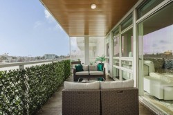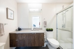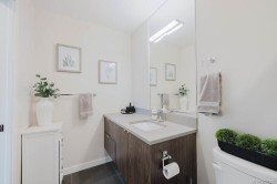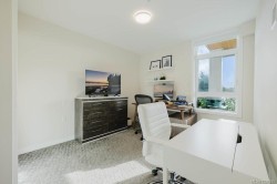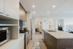 Immaculate offering at "The 881" at Uptown. This stunning 2-bedroom, 2-bath home is better than new, showcasing a series of tasteful custom updates throughout. The open-concept kitchen is appointed with European soft-close cabinetry, quartz countertops, a glossy tile backsplash, Samsung stainless steel appliances, and a clever custom pantry/office nook for added versatility. The spacious primary suite features a beautifully upgraded custom glass shower—a standout enhancement that elevates both style and comfort. Year-round climate control is provided by a VRF heat pump system delivering high-efficiency heating and cooling, complemented by centralized gas hot water. Add to that a large south-facing covered balcony extending your living space and filling the home with an abundance of natural light. A Walk Score of 91. Ideal location close to shopping, restaurants, fitness, transit, bike and walking trails and more!