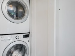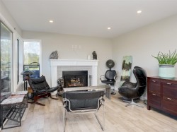 Welcome to #401, a beautifully renovated top-floor corner suite in a quiet, well-cared-for 10-unit building. This home feels fresh and modern with a soft colour palette and birch engineered hardwood floors. The living room is warm and inviting with a wood-burning fireplace and access to a west-facing balcony where you can enjoy evening sunsets. The kitchen offers bright white cabinets, wood-style counters, stainless appliances and a dining area surrounded by windows. The primary bedroom overlooks the nearby park and includes a walk-in closet with organizers. The bathroom has thoughtful tile details, in-floor heating, and natural light from a skylight. You’ll also find in-suite laundry, a tucked-away office nook, and secure parking. With natural light throughout and a location close to green space, this is a comfortable home to enjoy for years to come.