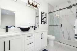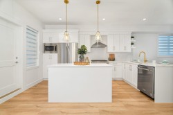 LAST 2 HOMES, MOVE-IN-READY at PRESTIGE by Sivia Construction* luxury duplex-style townhomes with private driveways in Fraser Heights. Spacious 4 Bed + Flex homes with rare 4-car parking, open-concept layouts, and premium finishes throughout.Designer kitchens include a KitchenAid appliance package with gas range, French-door fridge, built-in microwave, and dishwasher. High-end details feature soft-close cabinetry, custom lighting vessel sinks. Spa-inspired primary ensuite with side-by-side vanities and glass shower with body jets and rainfall. Additional features include gas fireplace, forced-air heating, A/C rough-in, and Navien on-demand hot water. Minutes to Pacific Academy, Parks , Guildford & Willoughby Town Centres.