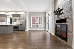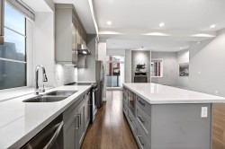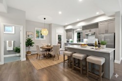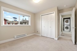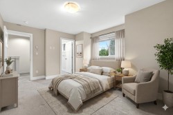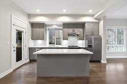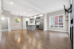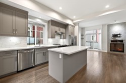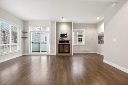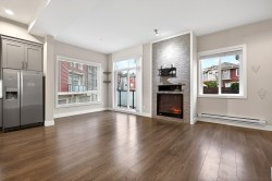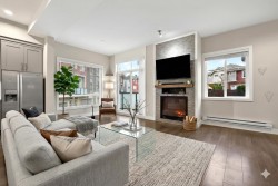 Welcome to Mackenzie Estates—where style, light, and function come together in this bright CORNER UNIT with a rare DOUBLE CAR GARAGE. Featuring 10' ceilings, an open floor plan, and a modern kitchen with quartz countertops and stainless steel appliances, the main level feels spacious and sunlit, complete with a south-facing balcony for morning coffee or evening unwinding. Crown moulding, designer lighting, and quality laminate flooring add an elevated touch throughout. Upstairs offers three comfortable bedrooms, including a generous primary suite. Set on the QUIET SIDE of the complex yet moments to transit, schools, parks, and future SkyTrain, this home delivers both calm and convenience. VACANT and move-in ready—choose your dates and make it yours.