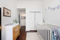 ONLY ONE LIKE IT IN COMPASS APARTMENTS – This unique, custom-designed penthouse condo features an impressive open-concept layout with soaring 12-ft ceilings. The living room, kitchen, and dining area flow seamlessly together, creating the perfect space for entertaining. Generously sized at 980 sq. ft., the unit offers newer paint and stunning engineered hardwood flooring throughout. Bright and beautifully lit with south-facing exposure. Includes a convenient in-unit storage closet. Comes with 2 parking stalls, Pet Friendly, New Dishwasher & Washer/Dryer. Walking distance to new Skytrain Station, Dog Park & All Shopping & Daily Needs. Truly a must-see—come take a look today!