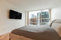 Immerse yourself in the vibrant lifestyle of Vancouver with this exquisitely furnished two-bedroom condo, offering 1149 square feet of luxurious living space. Perfectly designed for those who appreciate modern amenities and a prime location, this south-facing corner suite promises both comfort and style. The condo features a spacious king-size master bedroom, complemented by a second bedroom and two well-appointed bathrooms. The living area is enhanced by a flat screen TV, providing an ideal space for relaxation and entertainment. Air conditioning ensures a comfortable environment throughout the year, while in-suite laundry adds convenience to your daily routine.