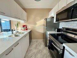 Come see this fully updated 1-bedroom + den on the 17th floor at the Conference Plaza. Expansive floor-to-ceiling windows w/ south exposure flood the home w/ natural light. Over $35K in modern renovations completed over the past 4 years, including a fully remodelled kitchen & bathroom, stainless steel appliances, new flooring, in-suite laundry, blackout blinds & more. Enjoy excellent amenities: indoor pool, hot tub, sauna, fitness centre & 24-hour concierge. Includes a secure, dedicated parking stall & storage locker. Perfectly located in DT Vancouver, just steps to Expo, Millennium & Canada Line SkyTrain stations, making commuting effortless. Surrounded by the energy of DT living w/ shopping, restaurants, SFU, BCIT & more right outside your door.