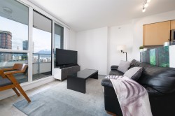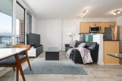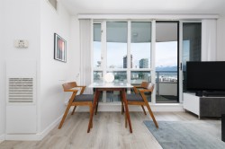 17th Floor with Sweeping Views! Perched on the 17th floor of Europa, this updated bachelor home offers panoramic city, water & mountain views. Bright & functional with new vinyl plank floors, fresh paint, modern lighting, updated bathroom, and full kitchen with gas range & appliances. Clever hydraulic storage bed included. Building amenities: A/C, in-suite laundry, indoor pool, hot tub, sauna, gym & bike storage. Steps to Chinatown, Gastown & local parks. Parking and Storage included!