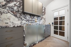 Purchased brand new in 2020, this exceptional residence underwent an immediate and transformative nearly $2 million designer renovation. Crafted with intention, artistry, and uncompromising attention to detail located just one block from the ocean, the home showcases INCREDIBLE quality marble craftsmanship with striking solid marble archways, dramatic stone detailing and oak herringbone hardwood throughout. The kitchen features premium appliances with beautiful seamless indoor-outdoor living to both private front and backyard retreats. Upstairs, 3 serene bedrooms are paired with spa-inspired bathrooms. A top-floor retreat, with a stunning pink onyx sauna, opens to a spectacular rooftop deck with gas fireplace. Steps to Kits Beach, the seawall, and vibrant cafés, boutiques, and restaurants.