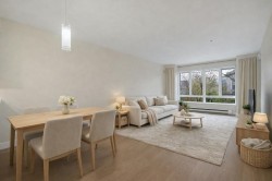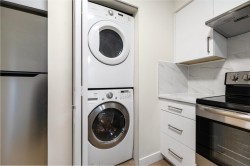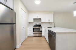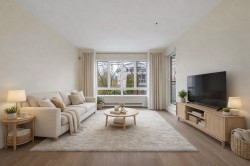 Welcome to Georgia Court. Newly renovated 1-bed + den home, situated off vibrant Commercial Drive. Freshly painted with new kitchen cabinets, wide-plank laminate, quartz countertop with bar seating, and stainless steel appliances. Other updates include new bathroom tile, backsplash, light fixtures, roller shades, and more. Spacious floor plan with in-suite laundry, a large den for home office or storage, and balcony facing a quiet garden path & lane. Two dogs or cats allowed in a fully rain-screened building with a proactive strata. Walking distance to public transit, parks, and schools (Britannia Elementary, Templeton Secondary), with quick access to The Drive. Move-in ready - call this one home today ! OPEN HOUSE: 2-4pm Sat, Feb 7 & Sun, Feb 8