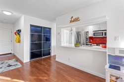 Welcome to this bright & spacious corner unit condo in the Boardwalk! This lovely 2-bed, 2-bath freshly painted home offers the perfect blend of tranquility and modern convenience. Step into the bright open-concept living space featuring hardwood floors, quartz countertops, s/s appliances & laqquer cabinets. A large private deck overlooks a serene courtyard with fountain and is ideal for relaxing or entertaining. The well-maintained rainscreened building offers fantastic amenities, including gym, recreation room, guest suite & work shop. All of this is just steps away from the vibrant River District which has a variety of restaurants, shops and all that the area has to offer. The central location gives you easy access to everything!