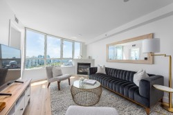 This beautifully designed 2bdrm plus spacious den offers flexibility to suit growing families or professionals seeking extra space. Completely renovated n 2020, this home showcases hardwood flooring throughout, stone countertops, stainless steel appliances and A/C for year round comfort. Overlooking Andy Livingstone Park with unobstructed views to False Creek and city skyline. Building amenities include concierge, indoor pool, steam/sauna, hot tub and exercise room. This versatile and stylish home delivers refined finishes, adaptability and spectacular scenery.