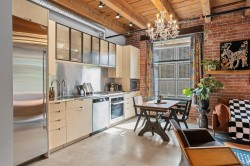 KORET LOFTS – Gastown's iconic live/work warehouse conversion, designed by award winning Yumi Murayama of YU+ME Design Inc. This home boasts a customized renovation. The open concept layout has ample storage, a beautifully crafted kitchen with custom white birch millwork, glass paneling, & marine edged stainless steel countertops & backsplash. The kitchen has top of the line MIELE appliances & a Sub Zero fridge/freezer. The bathroom exudes sophistication with Cosentino Dekton stone countertops from Spain, an angled matching stone sink, a stunning double walk in terrazzo tiled shower, Brizo fixtures, and BOCCI lighting. Cutting edge LED Philips Hue smart lighting creates the perfect ambiance throughout the space. Ideal for live/work or rental opportunities.