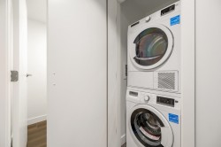 Welcome to Fraser Commons. This well-maintained 2 bedroom, 2 bathroom + den home offers a highly efficient open-concept layout with no wasted space, ideal for comfortable modern living. Bedrooms are thoughtfully located on opposite sides for added privacy, with a functional den perfect for a home office or extra storage. Enjoy heat pump with cooling and heating function, European Villeroy & Boch sinks and toilets, Liber Cucine cabinets, Bosch appliances, high quality finishes, and quiet inner-facing exposure with an open view to the garden. 1 Parking & 1 Locker. Good condition allowing for a smooth and flexible possession. Conveniently located close to transit, shopping, dining, daycare and everyday amenities—ideal for both end users and investors. Come view it today!