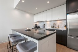Welcome to Mason by Boffo, a boutique collection of modern townhomes located across from Trout Lake Park. This bright, stylish home features private street entry, soaring 12-foot ceilings, oversized windows, and open-concept living. The sleek kitchen includes quartz counters, marble tile backsplash, matte lacquer cabinets, and premium appliances. Enjoy a sun-soaked west-facing patio off the primary suite and a second bedroom with space for a home office. Updates include new hardwood floors throughout, custom built-in closets, and a new hot water tank. Includes one secure parking stall, storage locker, and bike storage. Steps to Trout Lake, trails, Commercial Drive, and SkyTrain. A must-see!
