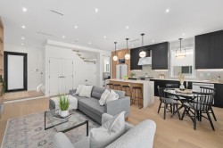 Discover refined living in this stunning 1/2 duplex by Mahnger Homes in the heart of Douglas Park! Elegant design meets luxury with warm tones, oversized windows, and brushed White Oak floors throughout. The large gourmet kitchen boasts sleek flat-panel cabinetry, quartz counters/backsplash, and premium matte white appliances. Upstairs, find the spacious primary bedroom with walk-in closet and balcony. The versatile third level offers a bedroom, guest room, or expansive family room opening to a covered deck—perfect for entertaining. Stay comfortable year-round with a heat pump for heating and cooling. Covered parking and 3 storage lockers add convenience. Steps from parks, cafes, top schools, and transit—this is urban living at its finest!