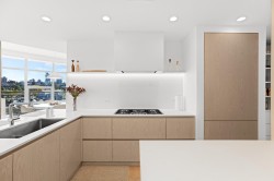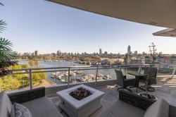 Exclusive waterfront residence at The Silver Sea, a boutique concrete building with only 31 private homes. This almost 1800 sq.ft. corner suite offers 3 bedrooms, 3 bathrooms, and panoramic views of the ocean, marina, Granville Island, and False Creek. Extensively customized with limestone floors, Lutron lighting, gas fireplace with powered TV lift beside, and powered blinds. The newly renovated kitchen features Caesarstone counters, top tier Miele appliances, walk-in pantry, and a 5-burner gas cooktop. Enjoy a spacious terrace with built-in fire pit. With private elevator access, 2 parking with EV, locker and amazing amenities all add to make this the down-sizers dream. A truly rare opportunity for serene urban waterfront living steps from the seawall and all that Yaletown offers.
