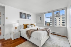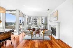 Prepare to be wowed by jaw-dropping, panoramic views from this stunning 2-bed, 2-bath corner suite in Harwood House. With prime SW exposure, this home captures incredible sunsets from every angle—whether you're on the 9x5 balcony, entertaining in the spacious living area, or cooking in the open-concept kitchen with S/S appliances. Floor-to-ceiling windows flood the space with natural light and frame the views, while hardwood floors, a cozy gas fireplace, and French doors to the primary bedroom add timeless charm. Smartly separated for privacy, the bedrooms include a primary with walk-in closet & ensuite. Just steps from Sunset Beach, the Seawall, and vibrant Davie Village, this is more than a home—it’s your front-row seat to stunning sunsets & waterfront living!