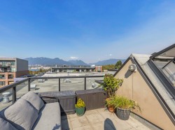 BRIGHT SOUTH WEST CORNER RARE PENTHOUSE #20 + Private 202sqft rooftop deck & 360° water, city & mountain views on the QUIET back side of building. 1 bed, 1 bath, 2 outdoor living spaces, stylish East Van living - feels like home and not a condo! The showpiece is a 202 sqft PRIVATE rooftop deck with 360° views of water, city & mountains & sunsets plus a 2nd balcony for morning coffee gives you 250+ sq.ft. of outdoor living. Inside, bright open-plan living flows into a modern kitchen with stainless steel appliances & smart design. Bedroom is a peaceful retreat filled w/ natural light. Added perks: in-suite laundry, secure parking & bike room. Penthouse living in the heart of EAST VILLAGE at The View — steps to boutique cafés, local shops, restaurants, and transit, with a vibrant community.