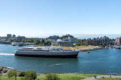 Open House: Sun 11-1 pm Unbeatable Songhees Location. Experience exceptional waterfront living in this pristine 2-bedroom, 2-bathroom condo at the highly sought-after Royal Quays. Positioned on the quiet side near the International Open House Sat 2-4pm | Marina, this spacious 1,200+ sq ft home has been lovingly cared for by the current owner and showcases active views of Victoria’s vibrant harbour, the Songhees walkway, and the distant Olympic Mountains. A cosy gas fireplace (included in strata fees) anchors the inviting living room. Enjoy the convenience of in-suite laundry, separate storage, and secure parking. This well-run, fully remediated building offers peace of mind and a welcoming community plus a fresh painted & caulked exterior. Long-term rentals are permitted, and pets are welcome (2 cats or 1 dog, no size limit). Steps from the waterfront trail, Boom & Batten restaurant, and shops - embrace an unbeatable lifestyle on Victoria’s stunning inner harbour.