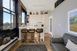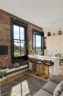 Experience urban living in the iconic Janion building, where heritage charm meets modern style. This bright SOUTH-FACING 2-bedroom features original exposed brick, oversized windows, and views of the bustling City, and Inner Harbour. Designed with efficiency in mind, it offers a built-in wall bed, integrated storage, engineered oak flooring, quartz countertops, a hidden-drawer dishwasher, refrigerator, freezer, and in-suite washer & dryer. Enjoy in-floor heating in the bathroom for added comfort. The Janion boasts premier amenities: rooftop terrace with BBQ and kitchen, fitness centre, conference room, bike/kayak storage, and internal beach access. Located in the heart of Downtown Victoria, steps to shops, dining, and the waterfront. Ideal for students, digital nomads, or snowbirds as it's fully furnished; this New York style condo is your gateway to the best of the city. Location, lifestyle, and iconic views—this is modern living at its finest.