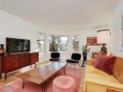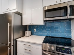 Introducing this fantastic, totally move-in-ready suite in the terrific and historic Rockland neighborhood. Features include 2 bedrooms, 2 bathrooms, including a spacious primary with walk-in closet and full ensuite, in-suite laundry, bright and sunny, open-concept living and dining areas with windows all around, leading out to two south and east-facing balconies, perfect for your outdoor relaxation. This suite was completely renovated in 2021, with tasteful upgrades that include a modern Ikea kitchen with beautiful quartz counters and high-end appliances, new bathrooms, new lighting, new flooring throughout, including gorgeous oak hardwood and wool wall-to-wall carpet. Small pets are welcome, and common amenities include roof-top deck with mountain views, secure parking, EV charger, bike storage, gym, storage unit, and workshop. This incredible location is a short stroll to downtown, parks, the waterfront, various eateries, and public transportation. Welcome home!
