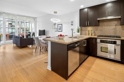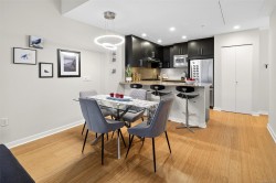 NEW LISTING! Located in the sought-after Dockside Green area of Vic West with upper harbour views. Bright, modern 1 Bedroom / 1 Bathroom suite combining easy living & contemporary design in well-run, eco-conscious building. Exceptional floor plan featuring a private entry hallway, oversized balcony perfect for entertaining & floor to ceiling Low-E windows. Notable features: bamboo flrs (carpet-less suite), wood cabinetry, granite counters & backsplash, stainless appliances, Whirlpool self-clean gas range, island breakfast bar, dining area & office nook. Luxurious ensuite w soaker tub, sep glass shower, stone counter, French doors. New screen door, smart LG washer/dryer 2024. Heat & water consumption interface. Secure 1 car & 1 motorcycle parking stalls, bike mount, storage locker, kayak storage & wash station, EV-charging approved. Pet & rental friendly. Proactive strata—move-in ready & beautifully cared for. Step to Galloping Goose waterfront trail, dock, shops, transit & downtown