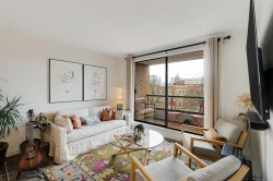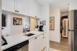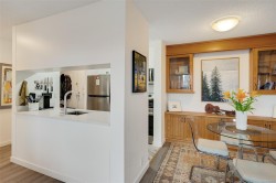 Open Saturday, February 7th 11:00AM to 12:30PM. Stylish and updated south facing unit in a steel and concrete building. Built-in dining room storage, as well as a home office desk in the bedroom, makes this a very functional space. Vinyl plank flooring throughout, updated kitchen with stainless steel appliances and herringbone flooring pattern right on style trend. Bathroom with clean and newer tub surround, and updated flooring and fixtures. Parking wait list available (approximate time is 3 months). The building offers a gym and steam room, dedicated bike storage, on-site caretaker, is professionally managed and has a healthy contingency fund. The laundry room has plenty of commercial machines-takes the worry of leaking and the maintenance of the machines out of your suite. Nothing to do but unpack. Seller transferred so wants this sold!