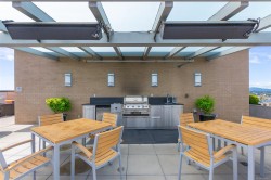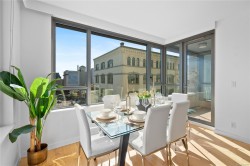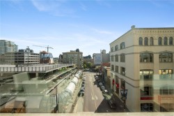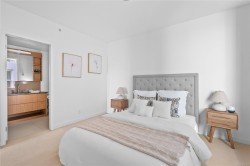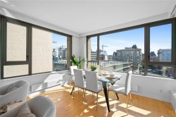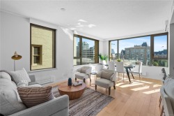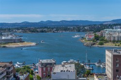 City, mountain, and harbour views await from this stunning 2-bed, 2-bath condo at The Sovereign in the heart of downtown Victoria. With nearly 1,000 sq ft, this home offers luxury, functionality and an unbeatable location, just steps from the Inner Harbour, shops, restaurants, and cultural landmarks. The bright, open layout features a balcony, office nook, and a gourmet kitchen with stainless steel appliances, gas range, stone counters, and a peninsula for four. The primary suite has a walk-in closet and a 4-piece ensuite with heated floors and a soaker tub. A second full bath includes a large walk-in shower. Enjoy comfort year-round with air conditioning and perimeter hot water radiant heat. Residents enjoy premium amenities, including a guest suite and a 12th-floor rooftop terrace with heaters, a gas BBQ, fireplace, and panoramic harbour views. Includes secure underground parking, storage locker, and bike storage. Heat, A/C, hot water, and gas are all included. Pets welcome!