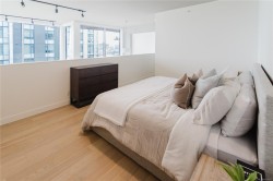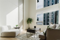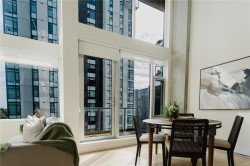 Immaculate and truly move-in ready, this exceptional loft-style residence is one of only two lofts in the building, offering a rare and striking living experience. From the moment you enter, the wow factor is undeniable, with a dramatic wall of double-height windows complete with motorized blinds, flooding the space with natural light and highlighting the trendy, modern design. The main level features a spacious open-concept layout with a generous living room, dining area, and sleek kitchen—an entertainer’s dream and the perfect condo for hosting. Upstairs, past a convenient two-piece bathroom, you’ll find a stunning loft bedroom retreat large enough for a king-sized bed, seating area, or home office. Bathed in sunlight, this level also includes a four-piece bathroom, custom closet, and laundry. An additional hallway access from the loft level, whether for easy moving or skipping the stairs altogether. The unit includes parking and a storage locker. Very quiet location in the building!
