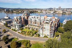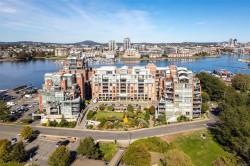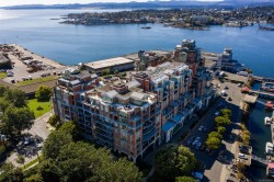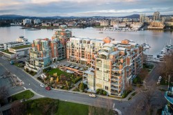 OPEN HOUSE SAT FEB 7, 1-3 Live the lifestyle you deserve at prestigious Shoal Point! Enjoy the morning sun and the greenery of Fishermans Wharf Park and views of the Inner Harbour from the balcony. This immaculately kept, 1 bed + DEN, 2 bath home features wood flooring through the main living areas. The kitchen, with granite countertops and gas cooktop, is open to the spacious living/dining room with gas fireplace, and balcony access. The bedroom features double closets and a 5 piece ensuite, with heated floors. A two piece powder room and den/storage room complete this lovely home. Amenities include: 25m lap pool, gym, steam, sauna, whirlpool, concierge, Bocci ball green, bike & kayak storage, workshop, library & 2 guest suites. The common lounge has a full kitchen for your use and a large deck with inner harbour views. Get to know your neighbours with Friday night happy hours. Located near Dallas Road ocean walk, restaurants, shopping, library & downtown all within walking distance.