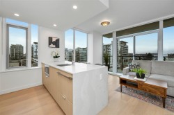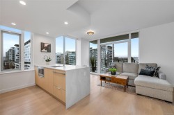Listed 12% below the most recent 2026 BC Assessment! Newly-built by Chard in 2024 - lots of time left on the New Home Warranty (BC builders 2-5-10 yr) 7th floor - 675 sq ft condo includes a 95 sq ft northwest facing balcony. Fully air conditioned 1 bed 1 bath luxury corner unit with 9.5 foot ceiling. Inside, find a handy wine fridge and an amazing layout - open concept living space & floor to ceiling windows. The “U” shaped kitchen has quartz counter tops/backsplash, Fisher & Paykel appliances including a panel ready refrigerator, w/separate freezer, dishwasher, induction stove stop, built-in oven, built-in microwave and ample drawer/cabinet storage. Bathrooms include terrazzo inspired heated tile floors, motion-activated kick lights and generously-sized medicine cabinets. Additional $10K of upgrades including built-in closets and wall unit in the living room. Separate storage locker (#60), Private bike storage space (#57), workout gym, dog wash, MODO, bike share. Outstanding location!